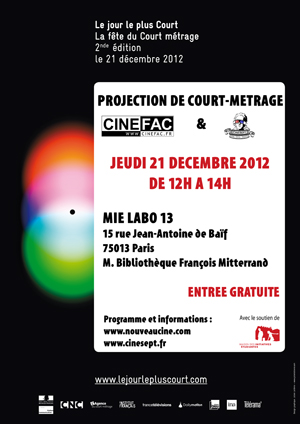 Dans le cadre de la seconde édition du Jour le Plus Court, la fête du court-métrage, CINE FAC et Cinésept, vous invitent à passer de votre pause déjeuner en compagnie de courts-métrages à la MIE-Labo 13.